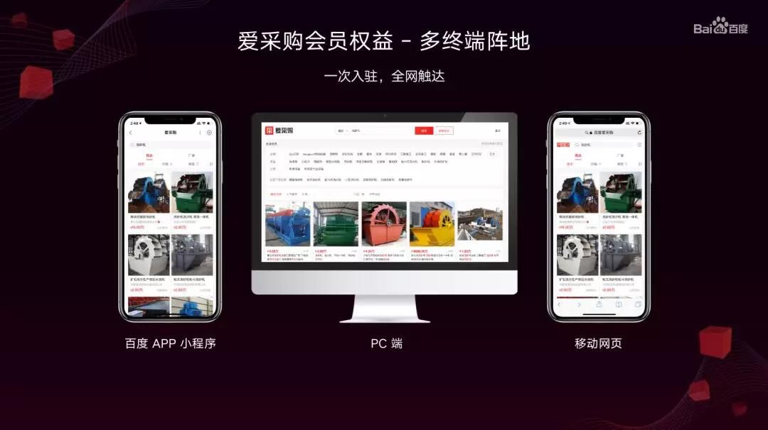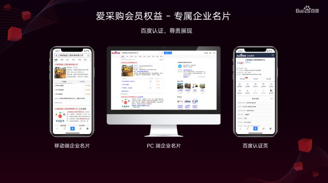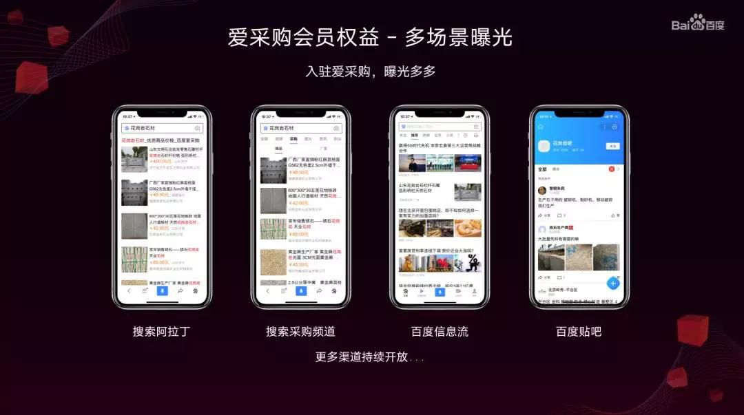 新一轮的营销变革:百度爱采购推广互联网的普及与发展,流量成本的增高,使得企业的营销方式发生改变,原有的传统营销方式不再适于新时代背景下企业的发展方向。信息化背景下,精准触达的交易方式成为企业发展的新方向,百度爱采购因运而生。 百度爱采购平台全球最大的中文搜索引擎——百度旗下的B2B平台,是一个垂直搜索引擎,旨在帮助用户更好地解决企业发展难题。平台背靠百度强大的搜索技术,服务海量用户,并利用AI技术,极速处理信息,完美匹配需求线索,精准触达买卖双方。百度爱采购平台四大权益: 专属企业名片:企业名片是指在百度搜索企业名称时,出现在搜索结果中的强样式特型卡片展示,具有移动端企业名片、pc端企业名片及百度认证页。可以直观地看到企业的各项信息,帮助商家打造品牌,提升知名度。 多终端阵地:即多场景触发展现,是指企业的商品将展现在百度app小程序、pc端及移动端,用户在百度或百度爱采购首页,通过商品名称搜索、厂家搜索、产品型号搜索等多种搜索方式均可触发展现。 多场景曝光:就是指企业的商品在百度爱采购PC端、移动端、百度APP等端口都可以进行同步展现,覆盖面更广。搜索阿拉丁、采购频道、百度信息流及百度贴吧等渠道,增加曝光度。 多种采购线索分发:线索分发就是百度爱采购为用户提供多种询价方式,包括电话沟通、询价单沟通、IM沟通等等。百度爱采购会向入驻企业分发高匹配度的询价信息,促进交易达成。买家及卖家可体验交易全流程。